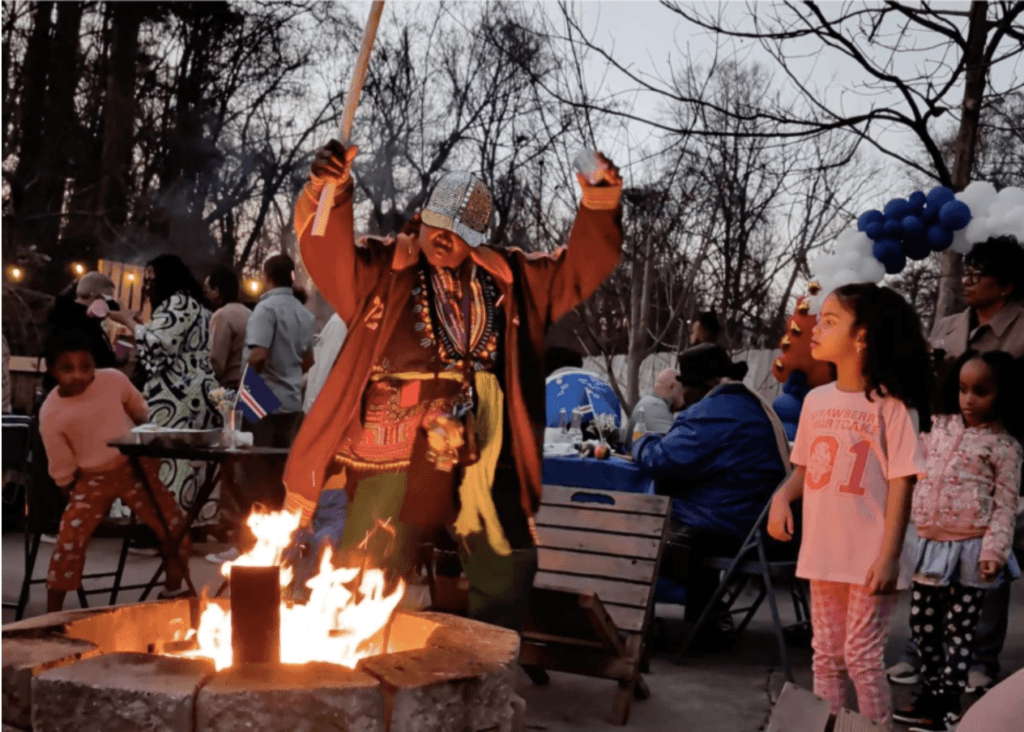 Across the flames, a guest decked out in vibrant colors grooves to the traditional beats that fill the air, telling a story through music and dance.